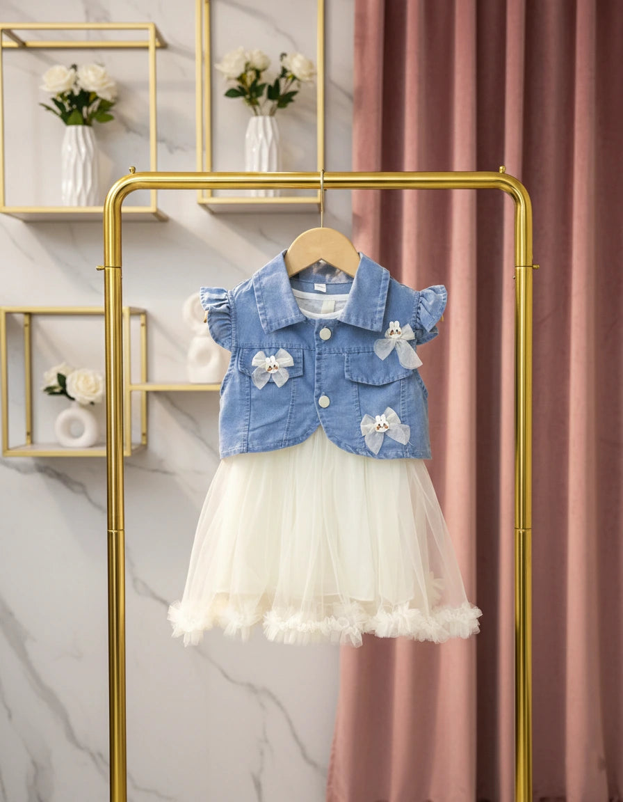 This dress pairs a structured, bunny-adorned denim vest with a cloud-like tulle skirt, making it the perfect chic choice for birthday galas, festive celebrations, or high-end photoshoots.