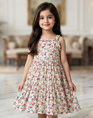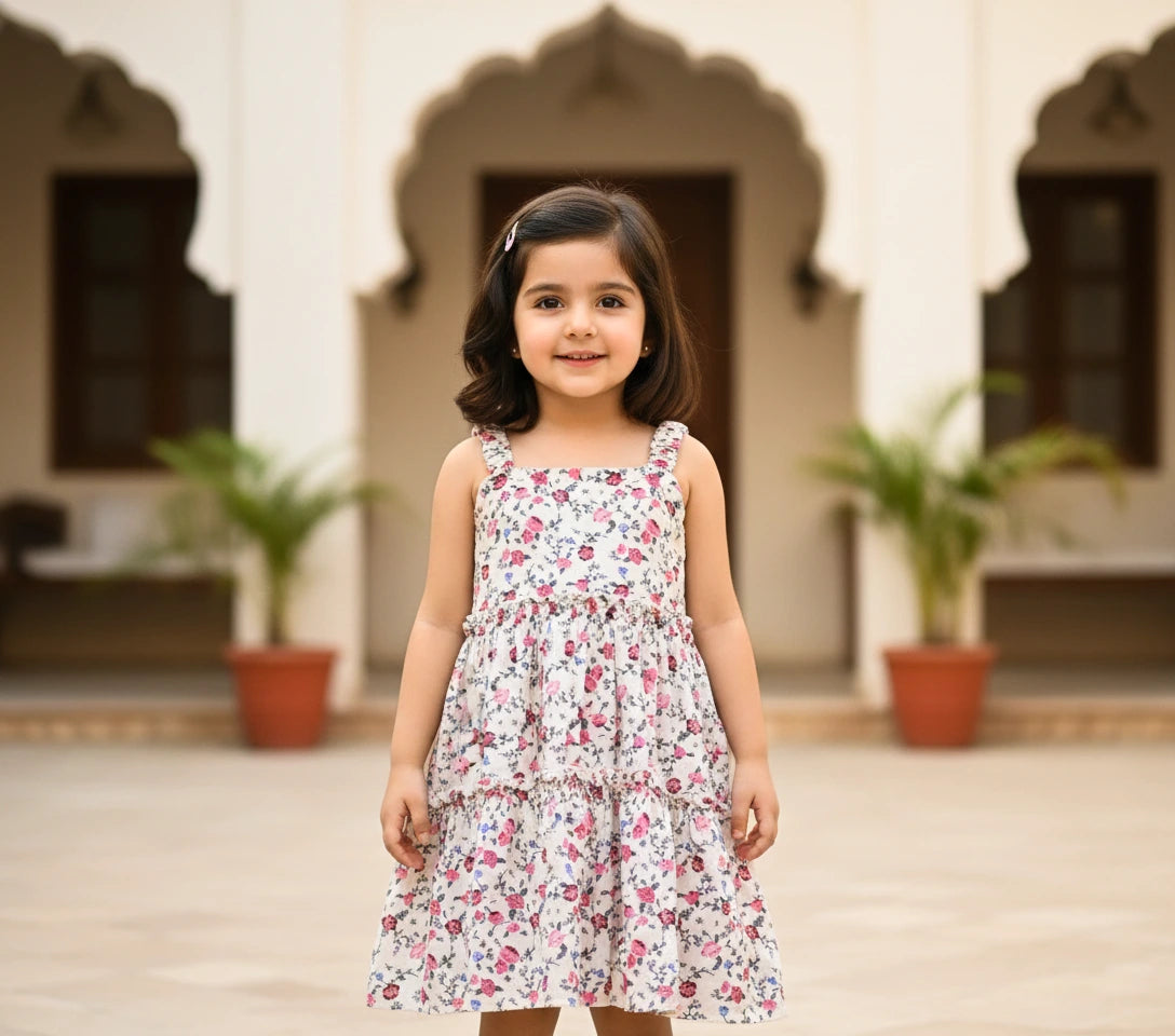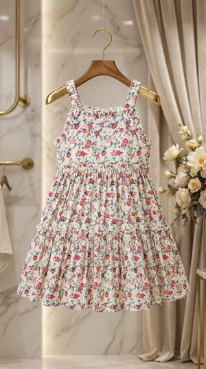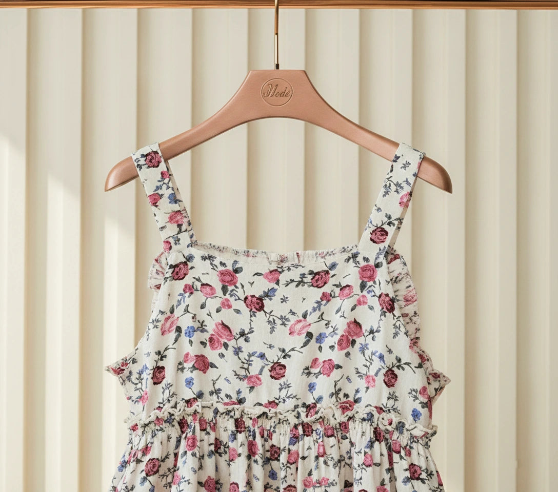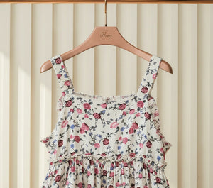 This piece combines a delicate botanical print with a classic breezy silhouette, making it the perfect chic choice for garden tea parties, family weddings, or sun-drenched holiday portraits.