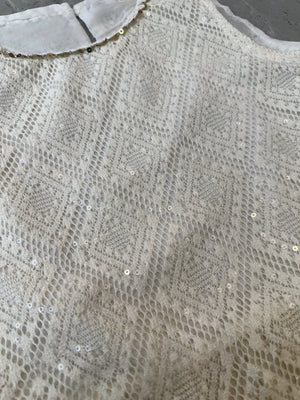 Texture: A sophisticated mix of textures, featuring intricate raised diamond-lace embroidery, a smooth pleated chiffon hem, and delicate scalloped lace edging on the trousers.