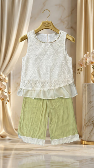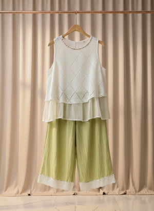 Elegant Crochet-Lace Top & Sage Wide-Leg Trouser Set