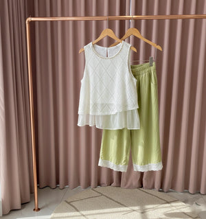 Colour: A fresh and sophisticated palette featuring an ivory cream top paired with soft sage green trousers, creating a look that is both modern and timeless.