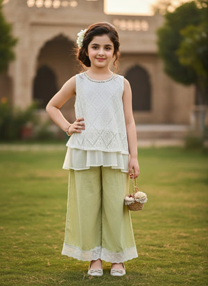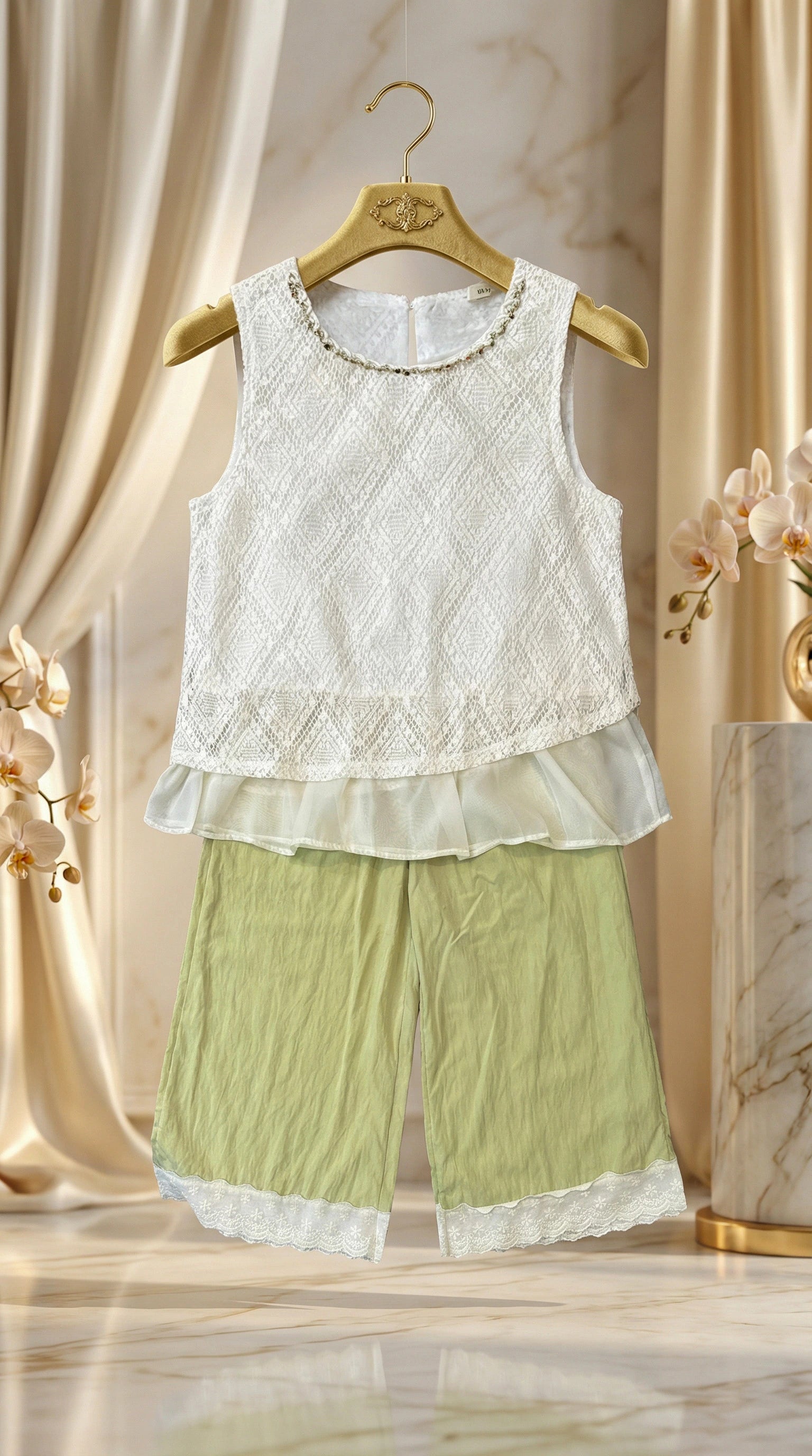 Dress your little star in unforgettable elegance with this exquisitely tailored two-piece set. This ensemble pairs a delicate diamond-patterned lace top with breezy, wide-leg trousers, making it the perfect chic choice for outdoor weddings, garden parties, spring celebrations, or any upscale event.