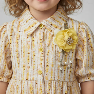 Colour: A vibrant and cheerful combination of colours. The top features a delicate, multi-hued pattern of peach, white, and lemon yellow vertical stripes with subtle metallic or glitter accents. The pants are a brilliant, solid sunburst yellow.