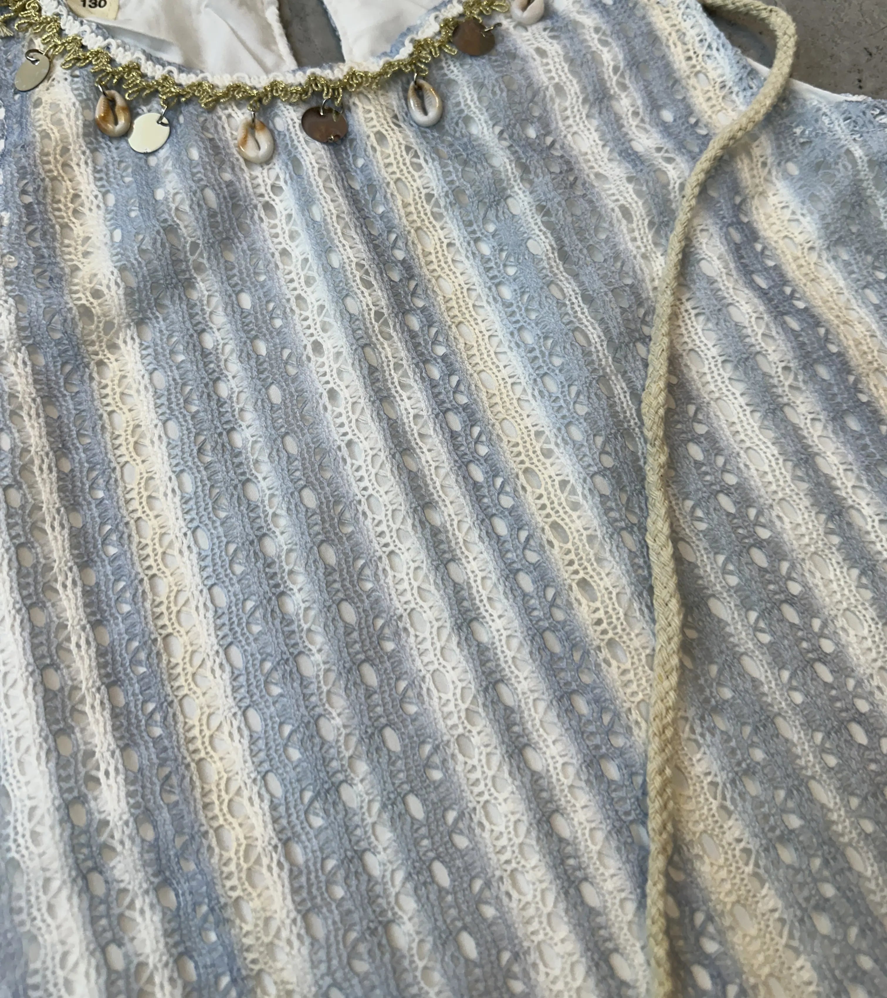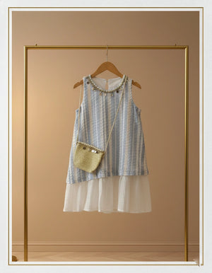 Colour: A sophisticated palette of sky blue and silver shimmering stripes paired with crisp ivory white, accented by metallic gold coin details for a touch of opulence.