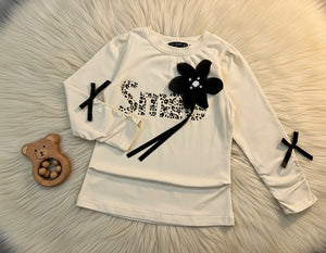 - Design: The top features a prominent "Smile" graphic with a chic 3D black floral appliqué adorned with pearls and ribbon accents. The pants boast a fashionable wide-leg cut with a comfortable elastic waistband, combining luxury fabric with a statement pattern.