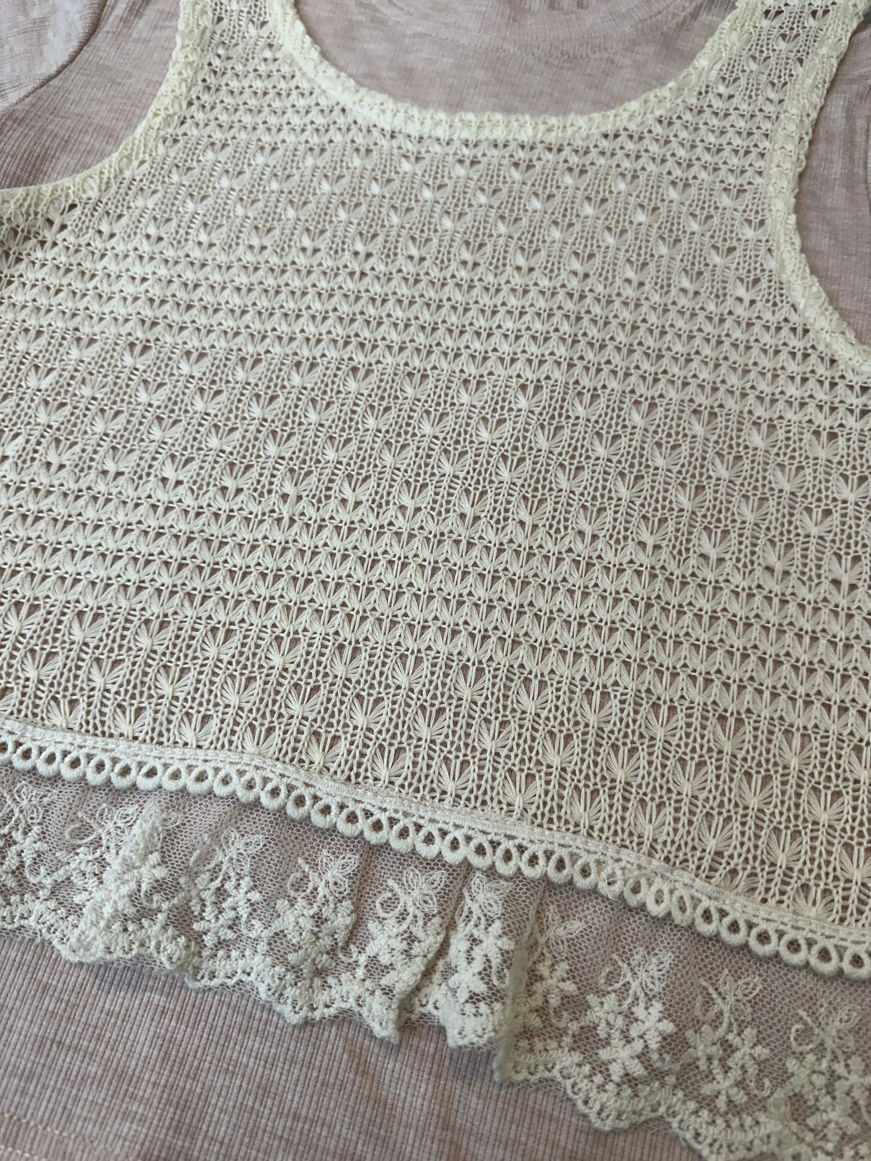 Intricate crochet lace overlay vest with a scalloped ruffle hem.