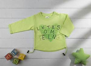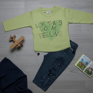 - Color: The top is a vibrant green with a playful graphic, paired with classic blue denim pants.