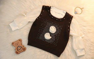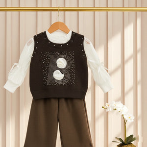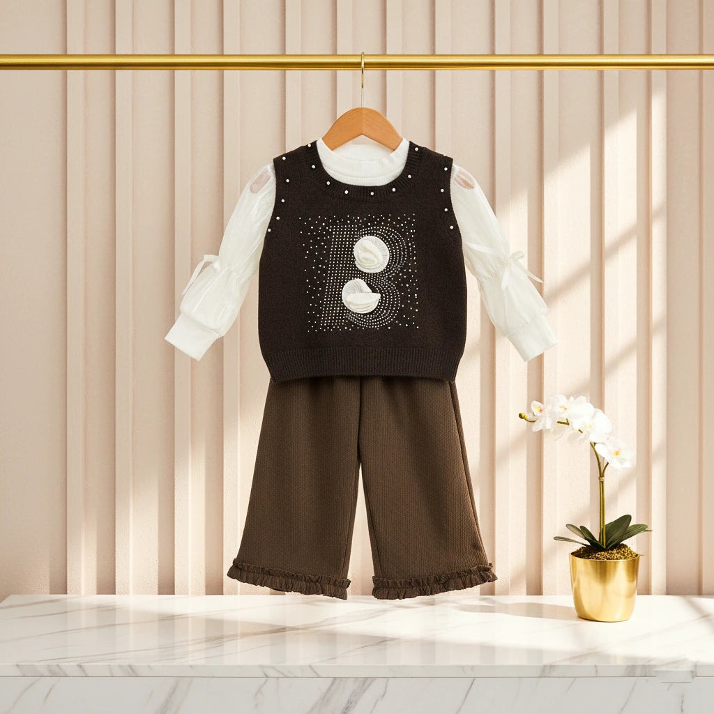 Chocolate & Cream 3-Piece Ensemble with Pearl Accents and Floral "B" Motif
